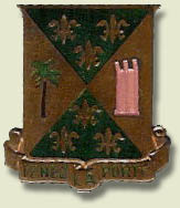 The colors are green and yellow for Military Police. The organization's World War II service in the European Theater is symbolized by the fleurs-de-lis and in North Africa by the palm tree. The Airlift Monument, erected in the Western Sector of Berlin, is used to represent the 759th Military Police Battalion's participation in the Berlin Airlift.